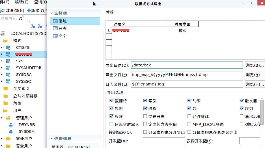 ./dexp userid=SYSDBA/'"密碼"'@127.0.0.1:5236 DIRECTORY=/data/dmdba/bak/ file=xx20251211.dmp log=xx20251211.log schemas=模式名