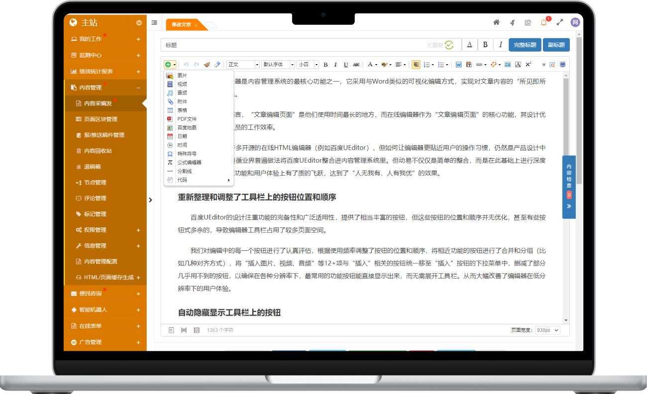 基于 UEditor 深度優(yōu)化,采用類 Word 可視化編輯方式、全面適配多設(shè)備,讓內(nèi)容編輯更輕松。
