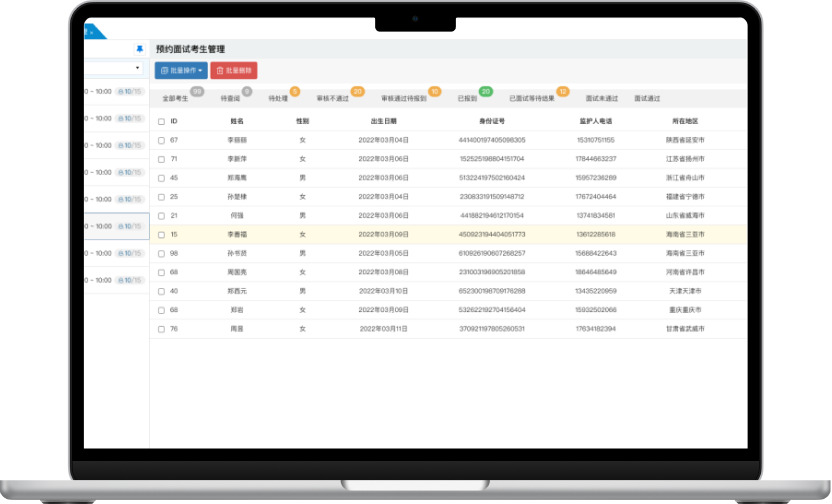 預約面試系統(tǒng)相比招考管理系統(tǒng),減少了組織筆試相關(guān)的功能模塊(如科目管理、考點管理、考場管理、座位管理、座位安排、筆試成績錄入等),也沒有面試日程表功能。但它增加了考生報到、查看排隊情況、以及叫號大屏幕等功能,專門針對大規(guī)模人員面試業(yè)務場景的需求進行了優(yōu)化。