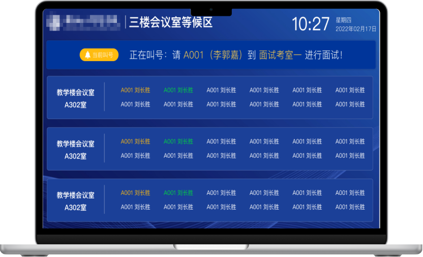 類似醫(yī)院的候診大屏幕設(shè)計,系統(tǒng)設(shè)計了專門的叫號大屏幕,實時展示并播報正在叫號的考生信息,同時顯示各面試教室中已排隊考生的序號,方便考生及時到達指定面試教室等候面試。
