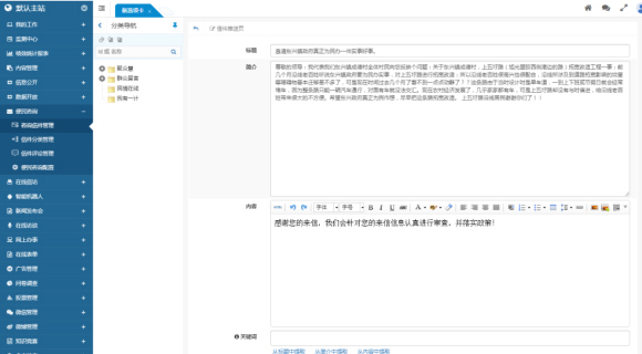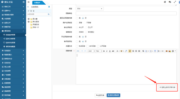 業(yè)務(wù)知識庫在內(nèi)容管理基礎(chǔ)上進(jìn)行了深度開發(fā),將內(nèi)容管理與領(lǐng)導(dǎo)信箱等模塊有機(jī)結(jié)合。在處理信件時(shí),管理員可以直接從業(yè)務(wù)知識庫中檢索參考回復(fù)內(nèi)容,而處理完畢的信件也可以推送到業(yè)務(wù)知識庫中,進(jìn)一步豐富和完善知識庫。此外,全文檢索和智能機(jī)器人功能會優(yōu)先展示業(yè)務(wù)知識庫的內(nèi)容,確保用戶能夠快速獲取到最相關(guān)的信息和參考資料。