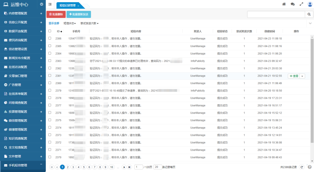 支持對短信發(fā)送記錄進行查看、篩選、搜索、刪除等功能,支持對短信進行重發(fā)等功能。