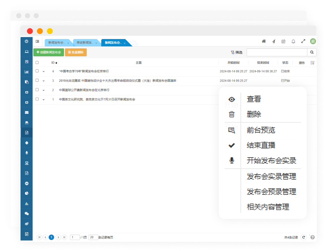 系統(tǒng)涵蓋新聞發(fā)布管理、發(fā)布會(huì)預(yù)錄管理、視頻直播與錄播、新聞圖文直播(實(shí)時(shí)推送)、網(wǎng)友提問(wèn)、相關(guān)內(nèi)容管理與分類管理、新聞發(fā)布會(huì)配置等功能模塊。支持圖文直播與視頻直播功能,并內(nèi)置文字敏感詞過(guò)濾功能,確保發(fā)布內(nèi)容的安全與合規(guī)。