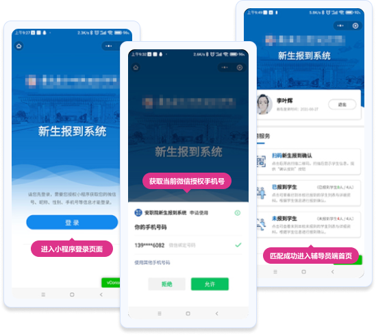 新生報(bào)到的學(xué)生端通過微信小程序?qū)崿F(xiàn)。學(xué)生到校后,掃描學(xué)校公布的二維碼進(jìn)入小程序。系統(tǒng)會(huì)自動(dòng)申請(qǐng)獲取當(dāng)前微信綁定的手機(jī)號(hào),并匹配相應(yīng)的新生數(shù)據(jù),顯示給學(xué)生核對(duì)。若信息無誤,學(xué)生即可完成報(bào)到,整個(gè)過程方便快捷。