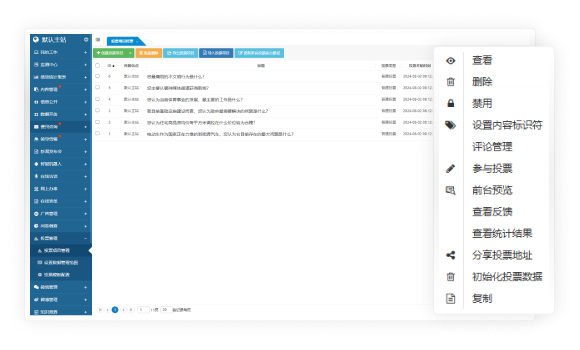 投票項(xiàng)目支持創(chuàng)建、修改、查看、刪除、搜索、篩選、啟用/禁用和前臺(tái)預(yù)覽等常用功能。還支持復(fù)制投票項(xiàng)目,方便快速創(chuàng)建類似的投票項(xiàng)目。主站可以使用子站的投票項(xiàng)目,以便更快地開展投票活動(dòng)。