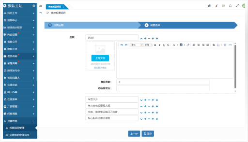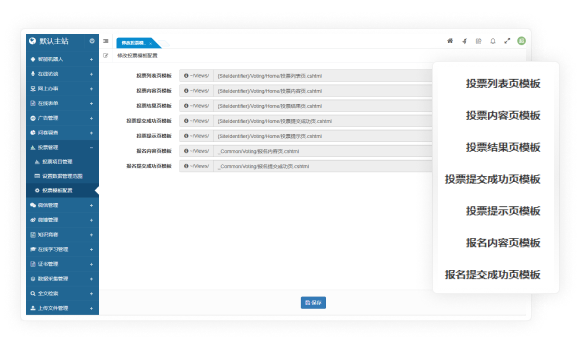 支持配置平臺(tái)/支持配置平臺(tái)/站點(diǎn)的投票列表頁、內(nèi)容頁、結(jié)果頁等頁面的默認(rèn)模板,并設(shè)置文件上傳等配置參數(shù)。