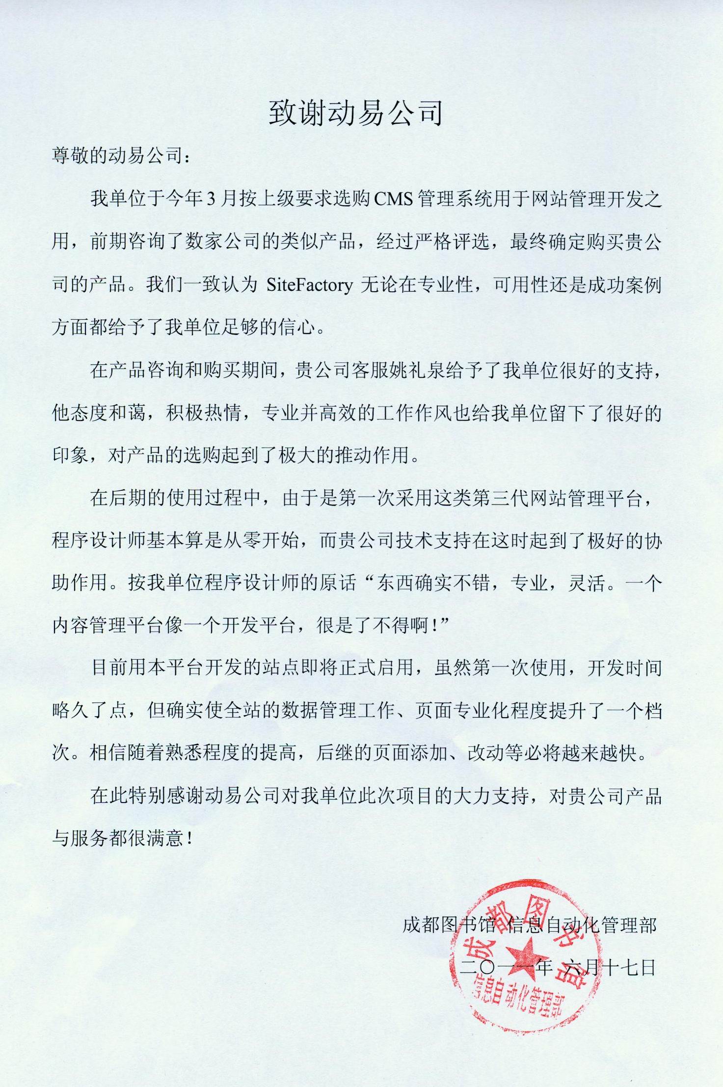 二零一一年六月十七日,動(dòng)易公司收到一封來(lái)自成都圖書館發(fā)來(lái)的感謝信,客戶在信中充分表達(dá)了對(duì)動(dòng)易客服姚禮泉和技術(shù)支持人員的深深謝意,同時(shí)也對(duì)動(dòng)易產(chǎn)品做出了很高的評(píng)價(jià)。