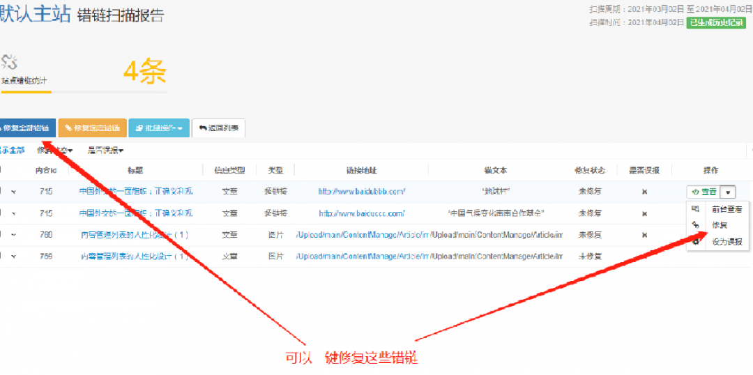 錯鏈掃描與修復功能,輕松消除錯鏈。也可按照平臺預先配置的修復方案來一鍵執(zhí)行修復。