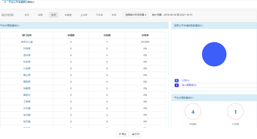 所有公開申請表辦理統(tǒng)計:可以對所有公開申請表辦理進行統(tǒng)計,可選統(tǒng)計時間范圍來統(tǒng)計。