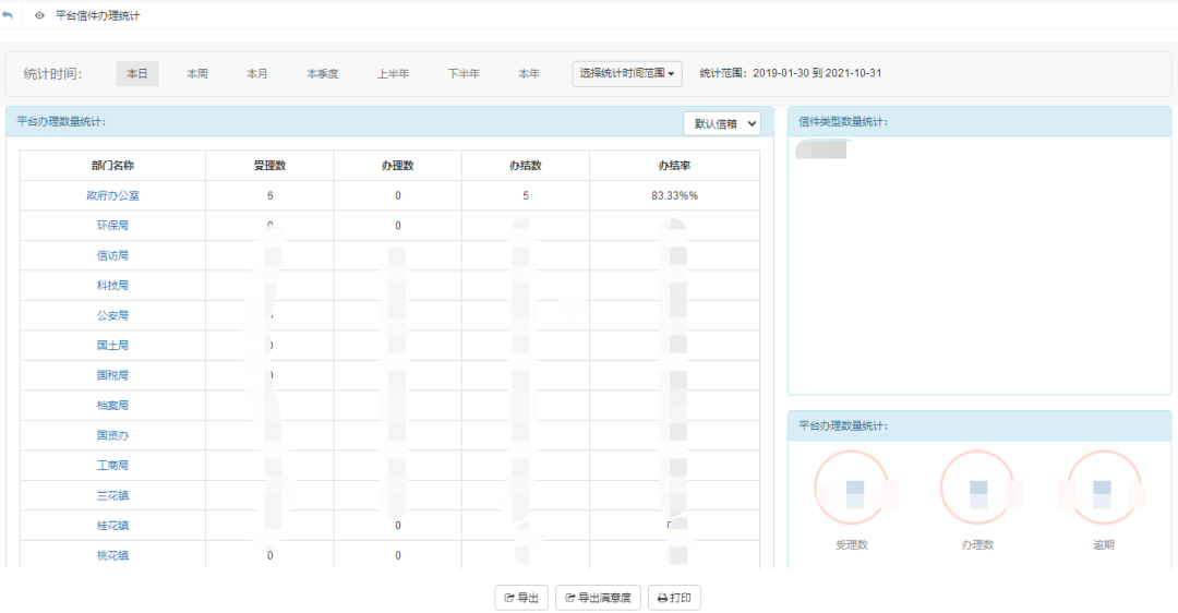 所有信件辦理統(tǒng)計:可平臺對所有信件辦理數(shù)量、結(jié)果進行統(tǒng)計,可選擇統(tǒng)計時間范圍。