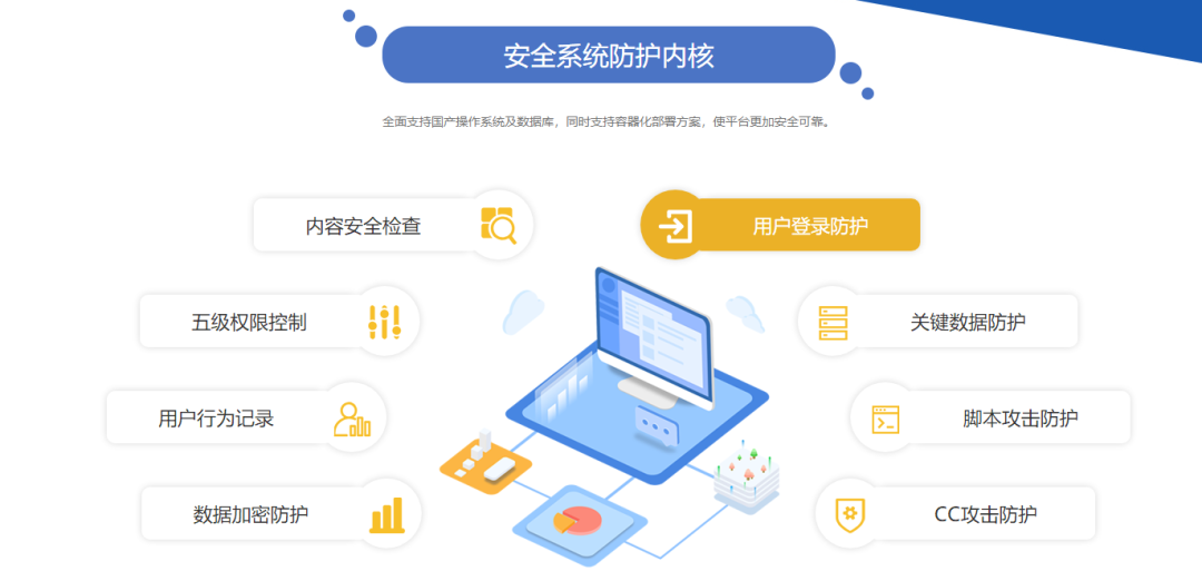 具備完善的安全體系防護系統(tǒng),動易產(chǎn)品已通過第三級信息安全等級保護的要求,全面支持國產(chǎn)操作系統(tǒng)及數(shù)據(jù)庫。同時方案還集成強大的安全系統(tǒng)防護內(nèi)核,保障平臺穩(wěn)定可靠運行。
