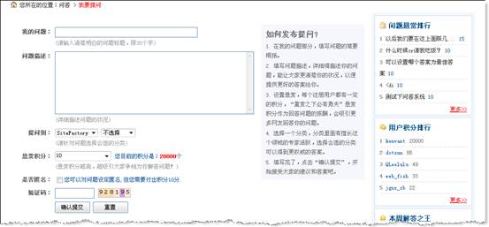 提問頁面與國內(nèi)知名的百度知道、新浪愛問相似,均支持標(biāo)題、內(nèi)容描述、分類選擇、積分懸賞、匿名設(shè)定、以及驗(yàn)證碼等各項(xiàng)主要內(nèi)容。目前不提供上傳圖片的問題支持,這是因?yàn)槿绻_放傳圖就會(huì)涉及安全、頁面樣式破壞等問題,而目前一般的問答如百度等都沒有對(duì)圖片進(jìn)行支持。