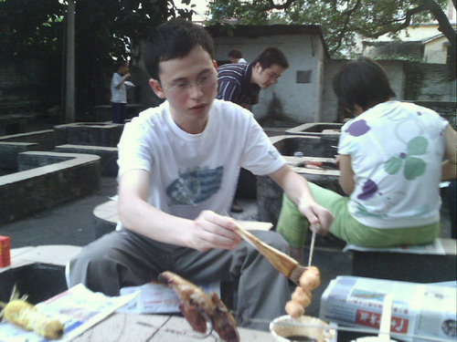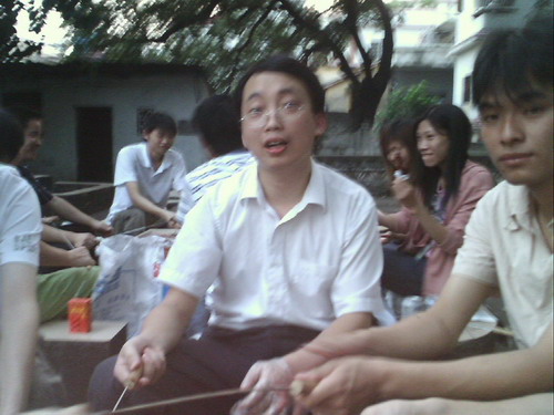 看到我們的技術(shù)實力如此差勁,粟總揚言要烤出雞腿的典范,振奮起動易的雄風(fēng)。只見他腳步穩(wěn)健、動作嫻熟、手持叉子上下翻飛,一招一式有版有眼,轉(zhuǎn)眼間就飄出烤肉的香味,還傳來“茲茲”的冒油聲,頗具風(fēng)范。終于等到戰(zhàn)果出來,眾人一瞧,嘿!排骨燒得還真不賴,油光亮滑的,果然高手;但雞腿就……在色澤及其它標(biāo)準(zhǔn)衡量下,最終還是普通了點,未能通過典范認(rèn)證這關(guān),不過總體說算挺好的啦。
