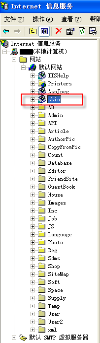 再一想,所有鏈接地址什么的都正確,只有圖片不顯示,會不會是找不到Skin這個目錄?或是打開他的Internet 信息服務(wù),查看網(wǎng)站中的設(shè)置,發(fā)現(xiàn)了默認(rèn)網(wǎng)站中多了個“Skin”虛擬目錄(下圖所示),這就是罪魁禍?zhǔn)祝涸L問時系統(tǒng)因為存在了同名的虛擬目錄,即訪問時當(dāng)作訪問虛擬目錄的方式進(jìn)行,與網(wǎng)站的Skin目錄相沖突了。刪除了這個“Skin”虛擬目錄后,一切恢復(fù)正常。
