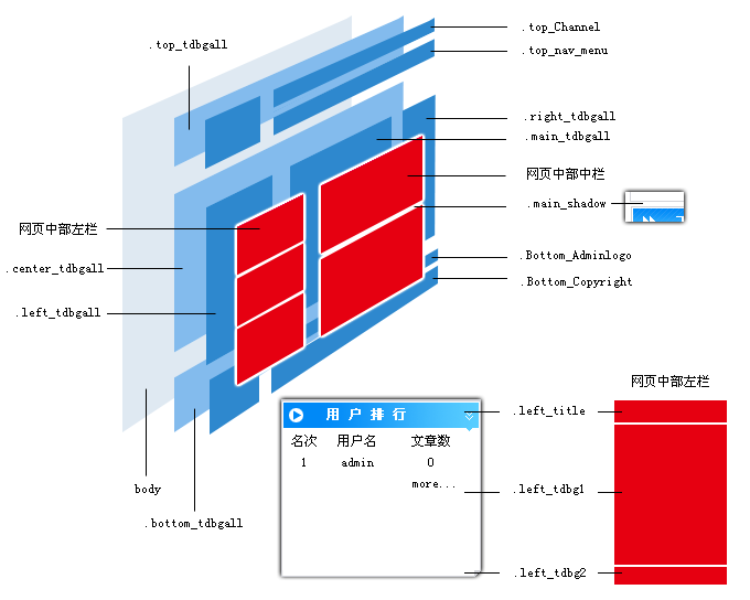 ·網(wǎng)頁頂部定義的樣式命名為:top_***; 在網(wǎng)頁中部定義中,按其位置劃分為左、中、右三個區(qū)塊: |