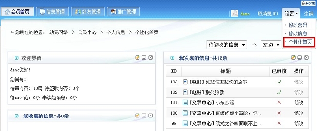在“設(shè)置”里有一個“個性化首頁”的選項,這里跟后臺工作臺的功能一樣,您可以隨意添加或者刪除需要的模塊,每個模塊還可以自由拖動(會員中心首頁也可以),設(shè)置完畢后在會員中心的首頁亦會同步更新。