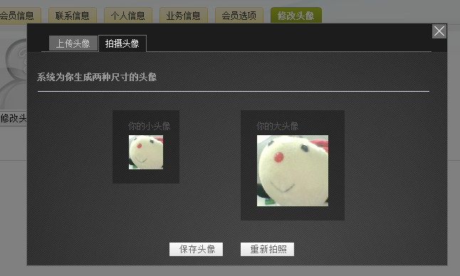 下面我們來看看有趣的頭像應用,可以直接在會員中心首頁點擊頭像進入修改頁面,或者在左側(cè)的“修改個人信息”來實現(xiàn)。更改頭像有兩種方式,您可以直接上傳頭像,或者使用在線拍攝頭像功能。拍攝完畢后還會出現(xiàn)圖片剪裁框,根據(jù)取景效果和拍攝質(zhì)量,可以自由調(diào)整畫面尺寸,使得頭像更加“精神”、展示自己的獨特風范。當然,如果感覺此次拍攝的質(zhì)量一般,還可選擇“重新拍照”。