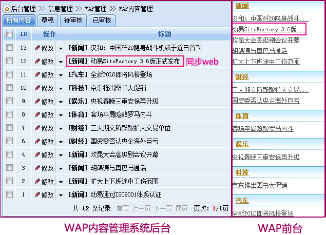在動易SiteFactory? 3.6里,用戶可以單獨添加WAP內(nèi)容或信息模型的內(nèi)容(即Web內(nèi)容),也可選擇兩者同步,這樣避免了信息的重復(fù)添加及加強了內(nèi)容的靈活性。