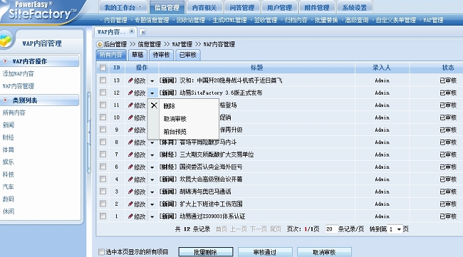 從下圖中可以看到,WAP內(nèi)容管理里有添加、刪除、審核及前臺預(yù)覽功能。