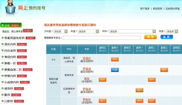 經(jīng)過上一步的操作,我們現(xiàn)在已經(jīng)進(jìn)入預(yù)約頁面了,大家可以在下面的截圖中看到,頁面呈現(xiàn)出了科室、專家的排班時間、是否可預(yù)約等信息,我們可以進(jìn)行仔細(xì)的查看,根據(jù)頁面提供的信息確定我們需要預(yù)約的專家情況。