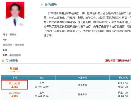 進(jìn)入預(yù)約界面后,系統(tǒng)會自動顯示出專家的醫(yī)療經(jīng)歷、門診時間等信息供我們查看,只要點擊下圖紅框中的預(yù)約日期后,根據(jù)下一步的提示進(jìn)行簡單操作,便完成了整個預(yù)約掛號的流程,接下來你要做的就是準(zhǔn)時赴約進(jìn)行診療了。