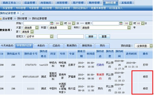 在開診當(dāng)天,醫(yī)院醫(yī)務(wù)人員可以根據(jù)實際門診赴約的情況進(jìn)行預(yù)約信息的修改,可以為準(zhǔn)時赴約的患者打印出預(yù)約單并將信息改為“已赴約”,將未赴約的患者信息改為“爽約”……系統(tǒng)將可以協(xié)助醫(yī)院對全部的預(yù)約信息進(jìn)行有效的管理和歸類。