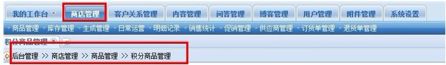 首先進(jìn)入系統(tǒng)后臺(tái)“商品管理”界面,點(diǎn)擊“積分商品管理”。