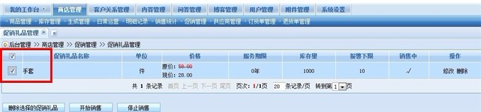 接下來(lái),在促銷商品管理中我們可以看到商品信息的最下方有促銷商品管理的操作鍵:“開始銷售”和“停止銷售”,勾選商品前面的小方框后,單擊“停止銷售”便可停止促銷商品的銷售功能。