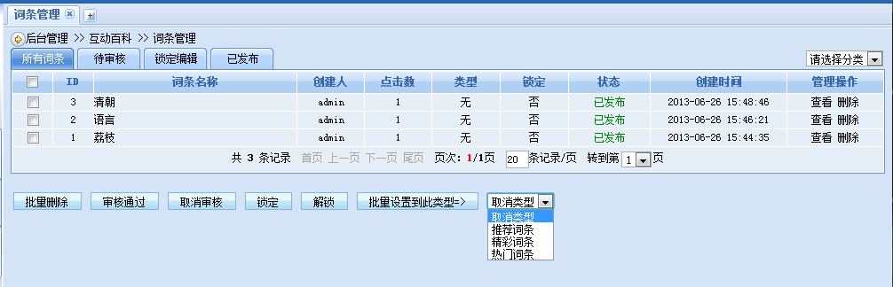 可以對(duì)詞條進(jìn)行管理,如審核\取消審核、鎖定\解鎖、設(shè)置詞條類型(推薦詞條、精彩詞條、熱門詞條)等。