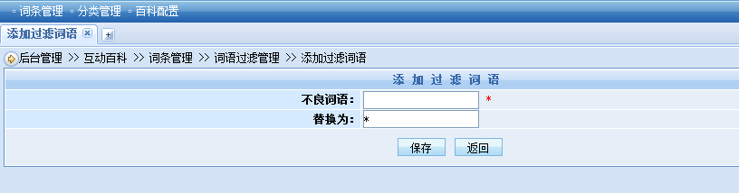 管理員可設(shè)置需要過濾的詞語,此處添加的詞條則視為“非法字符”,用戶在添加詞條時(shí),會(huì)自動(dòng)過濾掉“非法字符”,達(dá)到自動(dòng)攔截“非法字符”的效果。