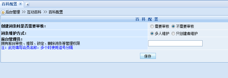 可以對(duì)百科配置進(jìn)行設(shè)置.如創(chuàng)建詞條是否需要審核;詞條維護(hù)方式可以選擇多人維護(hù)或只創(chuàng)建者維護(hù);設(shè)置前臺(tái)管理員,前臺(tái)管理員擁有的權(quán)限:編輯詞條、鎖定詞條、解鎖詞條、推薦詞條、刪除詞條、設(shè)置詞條分類等。