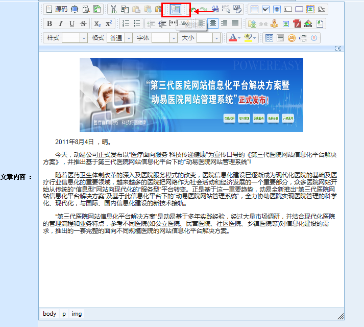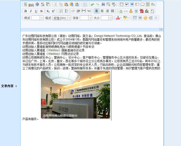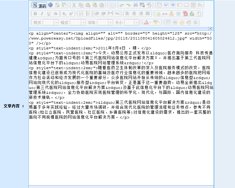 在動(dòng)易后臺(tái),進(jìn)入“添加文章頁(yè)面”,在編輯器中輸入文字,添加圖片后,此時(shí)文章無(wú)格式: