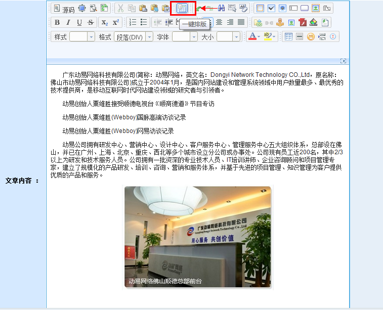 內(nèi)容管理一直是網(wǎng)站管理的核心功能,隨著技術(shù)的不斷進(jìn)步,越來(lái)越多的好用功能在為我們管理內(nèi)容提供便捷的服務(wù)。動(dòng)易也在不斷推動(dòng)這些功能的普及,提供了諸如可視化內(nèi)容編輯、圖文排版、流媒體管理、WORD圖片上傳等眾多實(shí)用功能,那么今天我們將要介紹的是另一款新的內(nèi)容編輯利器——一鍵排版。
