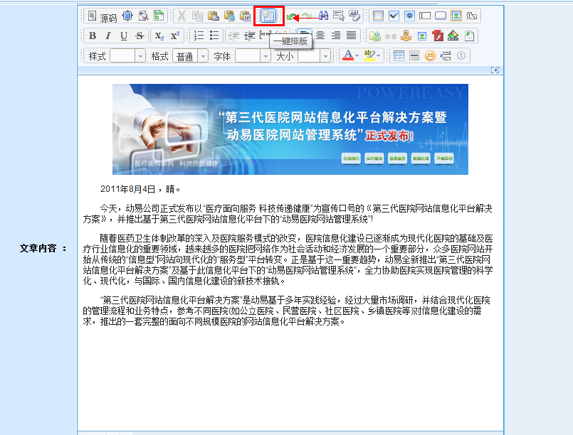 對(duì)于大多數(shù)人來(lái)說(shuō),日常編輯文章時(shí)常需要在文章的排版上消耗很多時(shí)間。如果你負(fù)責(zé)網(wǎng)站內(nèi)容更新工作則更為頭疼,每天對(duì)著N多需要對(duì)外發(fā)布的新聞,每篇新聞發(fā)布前,都得將文章排版成標(biāo)準(zhǔn)格式,費(fèi)時(shí)費(fèi)力,成為了編輯們“心中不可言喻的痛”。以往在動(dòng)易編輯器中調(diào)整文章格式時(shí),都得一項(xiàng)項(xiàng)手動(dòng)進(jìn)行,頗為費(fèi)時(shí)費(fèi)力,在動(dòng)易5.1版本中,大家利用“一鍵排版”功能將能更加輕松的進(jìn)行內(nèi)容編輯和排版工作。“一鍵排版”功能可以對(duì)文章進(jìn)行快速自動(dòng)排版功能。只需點(diǎn)擊一下按鈕,就可使之成為合乎規(guī)范和標(biāo)準(zhǔn)的文章格式。如果從word或網(wǎng)頁(yè)直接的復(fù)制粘貼文章,“一鍵排版”功能能夠?qū)Ω袷交靵y的文章進(jìn)行整理、編輯和快速排版,排版后的文章會(huì)被剔除所有的樣式,僅以段落為單位進(jìn)行排列,使文章結(jié)構(gòu)更加清晰,內(nèi)容更加干凈和整潔。