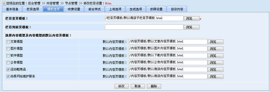 當(dāng)添加完商品模型后,我們還需要為商品添加分類欄目,并指定欄目的商品模型(一定要指定欄目的商品模型,否將不能在該欄目添加商品,一個欄目可以指定多個商品模型)。