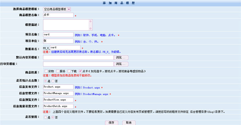 首先,我們需要添加一個(gè)點(diǎn)卡類的商品模型。這里,尤其要注意的是需要將“商品性質(zhì)”勾為選“點(diǎn)卡”,否則將無法使用點(diǎn)卡銷售的功能。