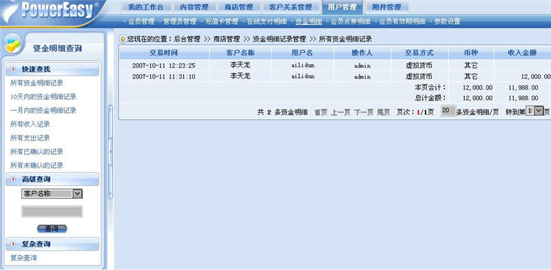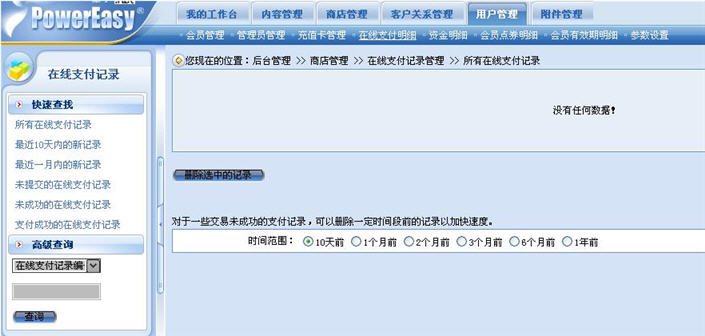 在網(wǎng)店中,在線的支付方式是最為普遍的支付方式,大多顧客都會選擇和使用此種方式來支付,于是在動易eShop2007用戶管理模塊中單獨設(shè)定了“在線支付明細(xì)”功能。