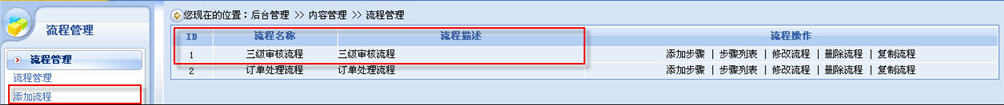 添加完稿件狀態(tài)后,我們就可以開始為稿件添加工作流程了,操作步驟為:登錄系統(tǒng)后臺——內(nèi)容管理——內(nèi)容模型管理——流程管理。這里,我們添加的是一個三級審核流程。