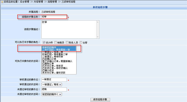 在添加步驟的頁面里,我們根據(jù)所設(shè)計的三級審核流程來指定該步驟的各種參數(shù),如:步驟名稱、可執(zhí)行本步驟的角色、哪種狀態(tài)的稿件可以執(zhí)行本步驟的操作、通過(不通過)該步驟的操作的命名、通過(不通過)該步驟的稿件狀態(tài)等。