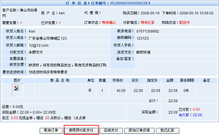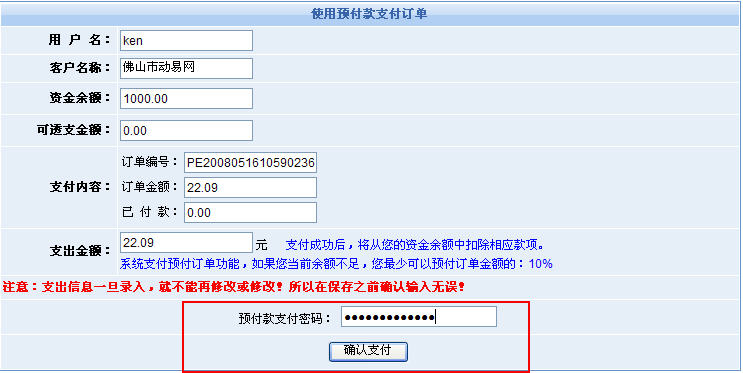 2、當(dāng)用戶使用預(yù)付款(帳戶余額)進(jìn)行支付的時(shí)候,系統(tǒng)將要求輸入支付密碼: