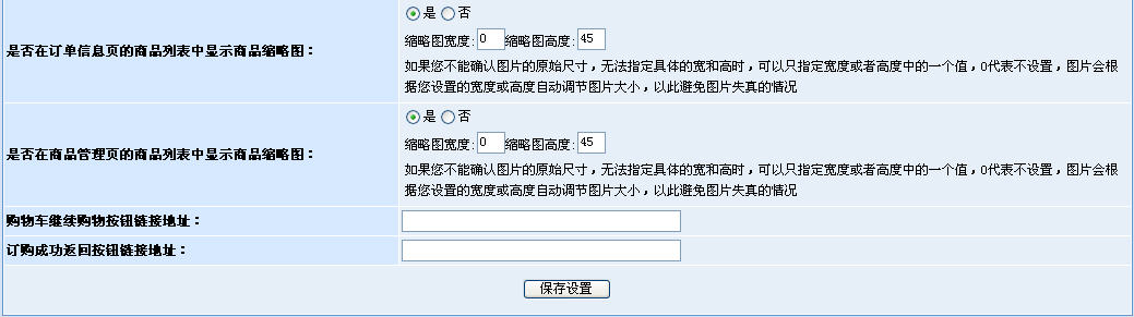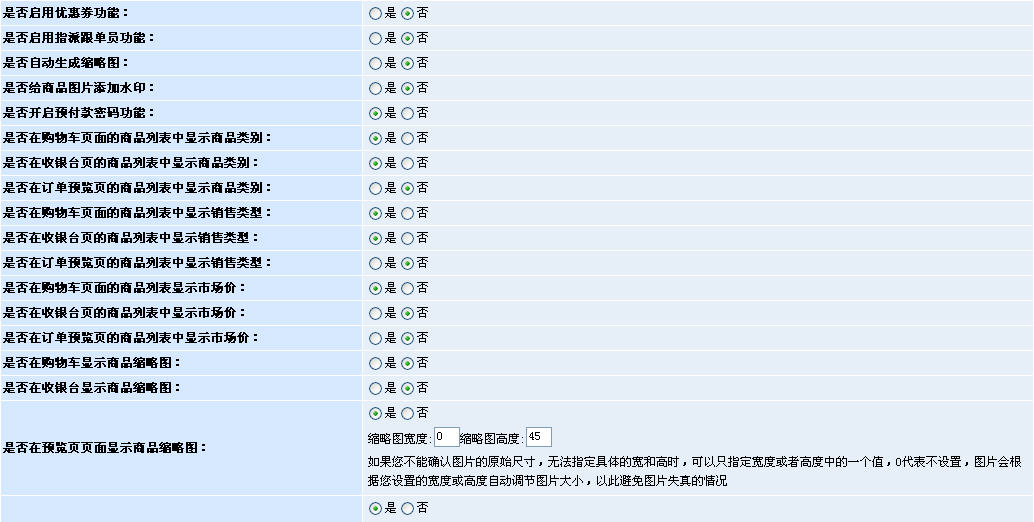 圖2。通過上圖我們發(fā)現(xiàn),這部分內(nèi)容主要是實現(xiàn)了對商店實際的業(yè)務運作過程中的操作界面的管理控制,如訂單預覽、購物車、收銀臺等頁面。而歸結起來,主要管理的功能有以下幾點:1、是否允許商品縮略圖的顯示;2、是否允許顯示商品類別;3、是否顯示銷售類型。通過這些設置,我們就能夠根據(jù)實際的需要,決定購物車、訂單等頁面的商品列表效果。這樣的好處也很簡單,就是讓商家能夠根據(jù)商店商品的特性,自行選擇合適的效果,比如:點卡類商品的訂購列表就是不需要有縮略圖的,而服裝類的商品則往往希望有縮略圖。