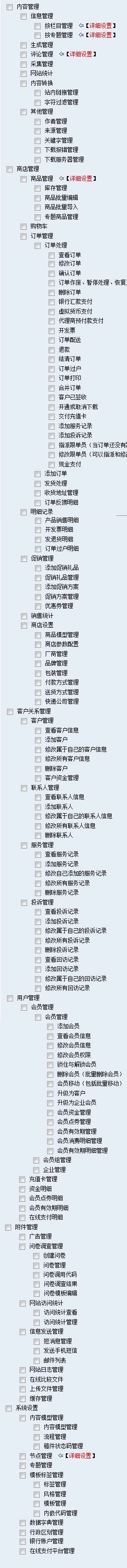 此外,樹狀目錄中的權(quán)限還配備了“詳細(xì)配置”的功能,為角色分配權(quán)限提供了更多種的配置途徑。下一節(jié)我們將以“信息管理”子模塊下的“按欄目管理”三級權(quán)限的詳細(xì)設(shè)置來進(jìn)行介紹節(jié)點(diǎn)的權(quán)限設(shè)置。