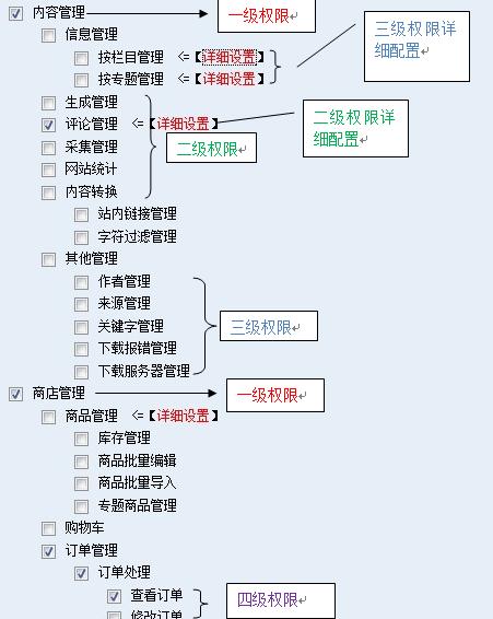 從圖中我們可以看到,SiteFactory? 的角色權(quán)限可細(xì)分到四級,每級權(quán)限都是上一級權(quán)限的再細(xì)分,如此龐大但聯(lián)系緊密的樹狀權(quán)限結(jié)構(gòu)就是“SiteFactory? 樹狀四級權(quán)限”。圖中“商品管理”——“訂單管理”——“訂單處理”——“查看訂單”的四級權(quán)限細(xì)分過程,直觀體現(xiàn)出了分工越來越細(xì)化的特點(diǎn),不僅讓網(wǎng)站單調(diào)的權(quán)限與現(xiàn)實(shí)社會分工細(xì)化的趨勢相互掛鉤起來,而且進(jìn)一步證明基于標(biāo)準(zhǔn)RBAC模型(角色)的訪問控制方法的優(yōu)勢所在。相信采用角色來處理權(quán)限的SiteFactory? 更能適應(yīng)政府、事業(yè)單位、企業(yè)等日常部門較多、分工較細(xì)化領(lǐng)域的需求。