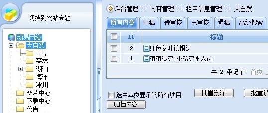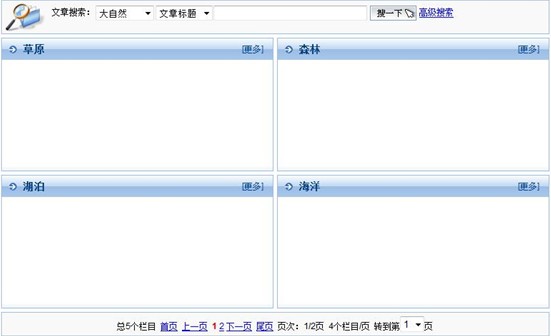 最后,瀏覽前臺(tái)可以看到,雖然沒有設(shè)置“欄目首頁(yè)模板”,但“大自然”欄目依然分頁(yè)顯示出了其子欄目,如下圖所示: