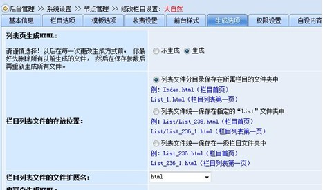 其次,“生成選項(xiàng)”設(shè)置如下圖所示,生成欄目列表頁(yè)。