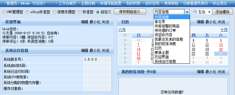 在SiteFactory? CMS 2.0中,開發(fā)組對“我的工作臺”進行了比較大的改動,引入了更多的OA功能,比如:自定義界面布局方案、自設模塊快速添加、待處理信息、備忘錄等功能。同時,也對SiteFactory? CMS 1.0版本中部分UI進行了修改,像“模塊添加”功能,由原來“多次點擊——勾選——點擊——保存”的方式,改進為“下拉選擇——添加保存”的方式。步驟大大減少,也提高了用戶體驗;另外還有“拖拽(Drag)”布局的速度和UI優(yōu)化、模塊編輯修改樣式等方面的改進。