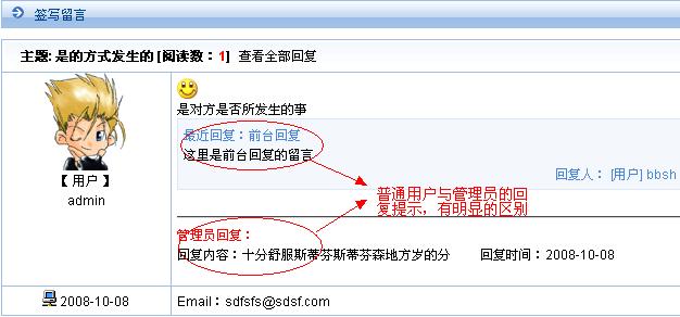 在SiteFactory? 1.0 版本中,管理員對(duì)留言的回復(fù)默認(rèn)前臺(tái)是看不見的,只有自己手動(dòng)在模板中調(diào)用相關(guān)標(biāo)簽才能夠?qū)崿F(xiàn)。SiteFactory? 2.0 版本中,新版本對(duì)這個(gè)問(wèn)題進(jìn)行了修改,除了讓管理員的回復(fù)默認(rèn)能夠顯示以外,還對(duì)管理員的回復(fù)進(jìn)行了特別的提示處理,如下圖:
