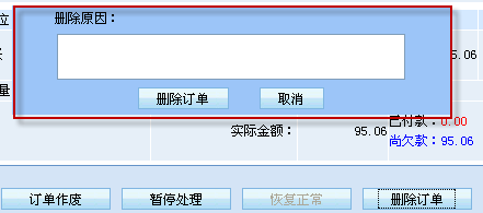 此外,對于訂單作廢、訂單暫停處理\恢復正常、刪除訂單等在訂單處理過程中的關(guān)鍵操作步驟,在執(zhí)行操作前還必須錄入操作原因,如作廢原因、暫停處理原因、刪除訂單原因等,以進一步確保該訂單得到安全妥善的處理。(圖2、3)