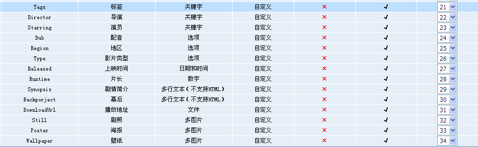 在視頻模型中,新增的自定義字段多達(dá)十幾個(gè),包括:標(biāo)簽、演員、導(dǎo)演、配音、地區(qū)、影片類(lèi)型、上映時(shí)間、片長(zhǎng)、劇情介紹、幕后、播放地址、劇照、海報(bào)、壁紙等等,基本可以滿足站長(zhǎng)對(duì)構(gòu)建視頻模塊的常見(jiàn)需求,另外站長(zhǎng)還可自行新增字段或者對(duì)已有字段進(jìn)行修改,以滿足自己的更多個(gè)性化需求。