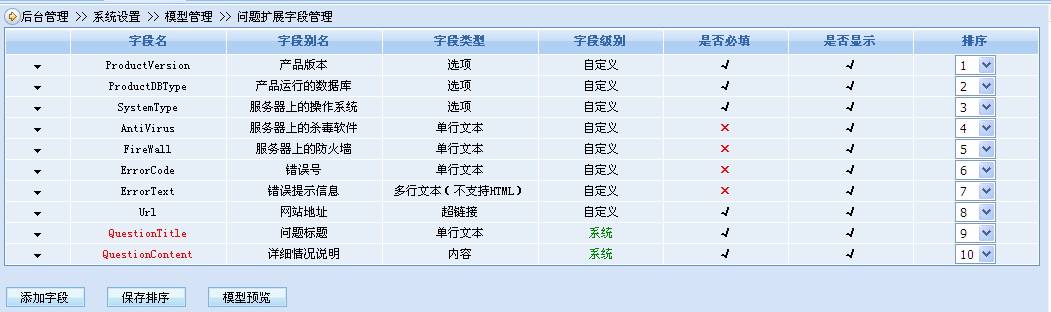可自定義問答類型,滿足各行業(yè)細分要求。如在軟件銷售行業(yè)中,將問答類型設置為產品版本、錯誤號、提示信息等與軟件使用相關的問答選項,可建立軟件公司自己的售后服務中心(商業(yè)或非商業(yè));又如在硬件銷售行業(yè)中,作為硬件產品的客服中心可以添加硬件的產品型號、購買日期、購買地點、故障信息描述等問題模型字段,等等。通過模型強大的自定義字段功能,滿足各種行業(yè)的不同需求。